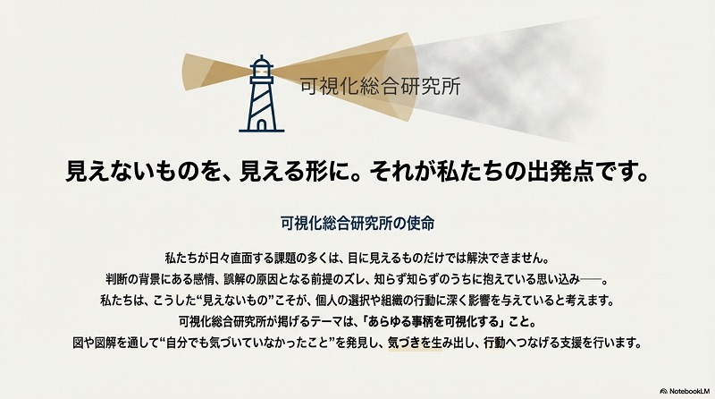 可視化総合研究所の使命は、あらゆる事柄を「見える化(可視化)」することです。